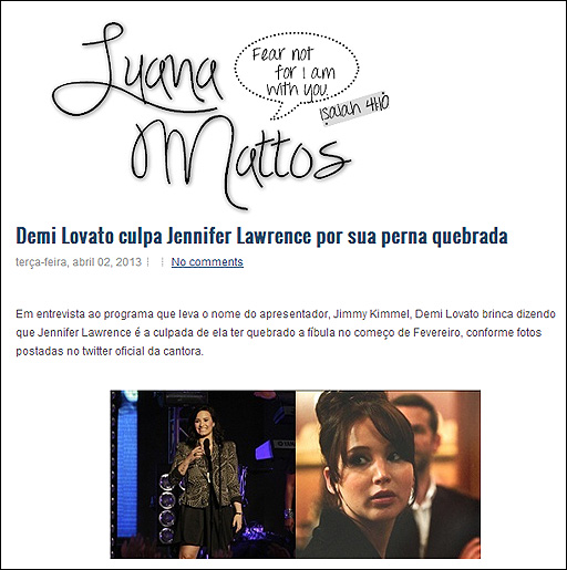 No blog da Luana Mattos vejam mais sobre a Demi e sua brincadeira com Jennifer Lawrence: http://luanatormesdemattos.blogspot.com.br/2013/04/demi-lovato-culpa-jennifer-lawrence-por.html