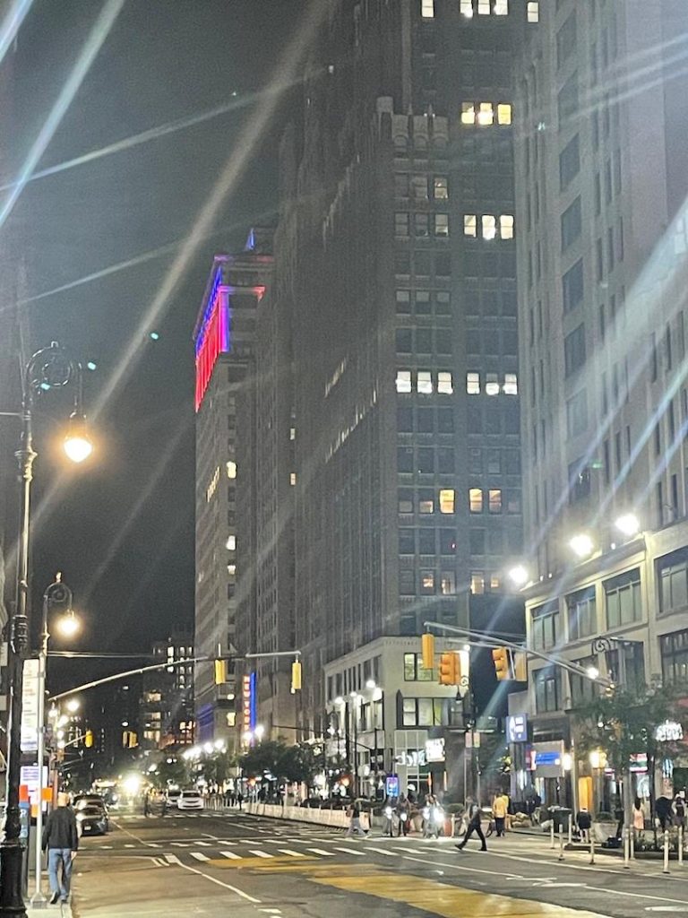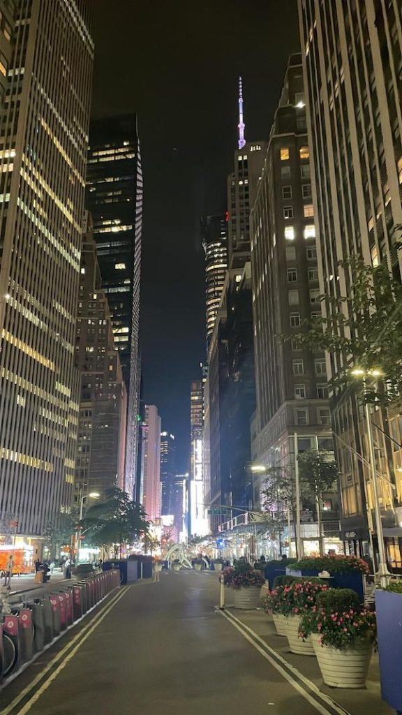 Uma característica de NYC, que é diferente das grandes cidades brasileiras, é a transformação da Ilha quando a noite cai. O “formigueiro” de turista e New Yorkers que lota as calçadas de dia se recolhe e os boêmios caminham tranquilamente, contando apenas com a companhia dos prédios suntuosos na madrugada.