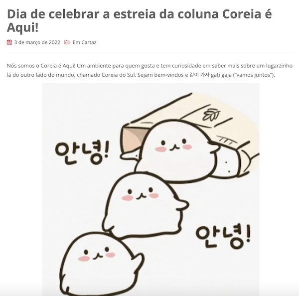 Esse ano, como um anjo que adivinha nossos pensamentos, ela propôs a criação da coluna Coreia é Aqui, um espaço em que pudesse compartilhar sua paixão pela cultura e o entretenimento do país.