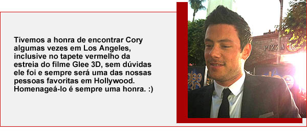Uma tarde com muitas emoções e lembranças, choros e risadas e, acima de tudo, muito amor e apoio. Além dessa homenagem maravilhosa, queremos reunir os fãs de “Glee” para que possamos fazer novas amizades e nos divertir, porque era isso que o Cory queria. Uma data repleta de lembranças, além de sorteios, games e karaokê.