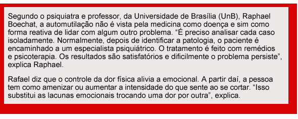 A sensação de alívio e melhora efêmera que se tem ao mutilar-se é real, porque é algo que quem faz é capaz de controlar. É se distrair da dor emocional, que não tem tamanho ou comparação, com a dor real, que pode ser acabada quando você parar de se machucar. Mais do que marcas visíveis, são marcas na alma. Mas, assim como uma distração, pode ser mudada. Você pode tentar se abrir com os seus pais ou outros familiares mais próximos, os seus amigos ou, até mesmo, um psicólogo, que é o mais recomendado. Buscar refúgio em coisas que gosta e impor desafios a si mesmo: por hoje eu não vou fazer.