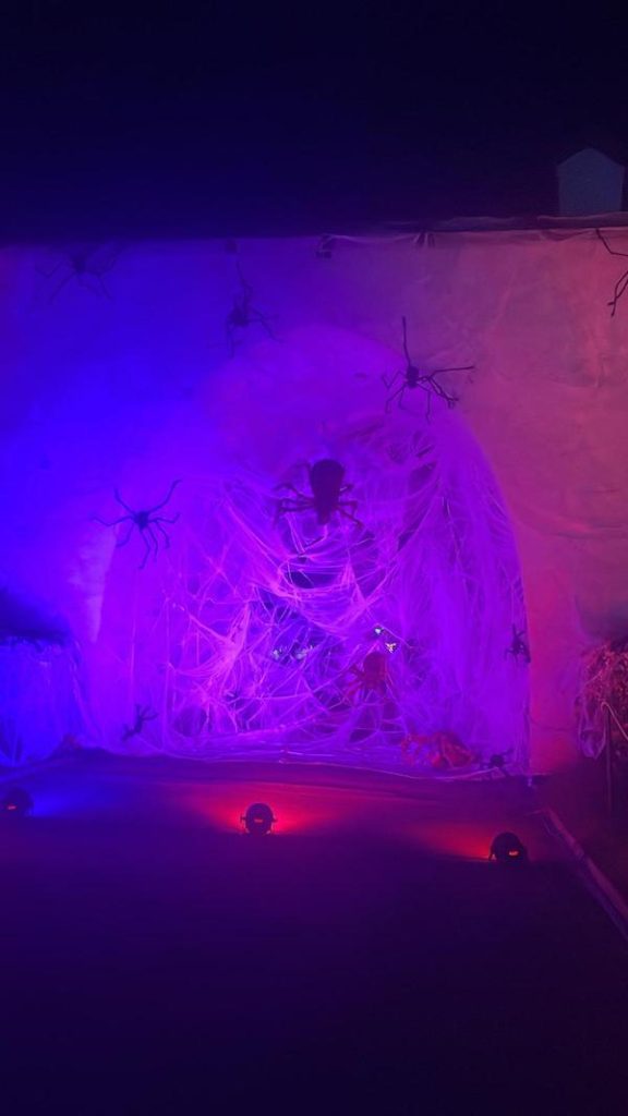 Tem túneis com bruxas voando, música do Caça-Fantasma, cemitério e caveira no melhor estilo Halloween.