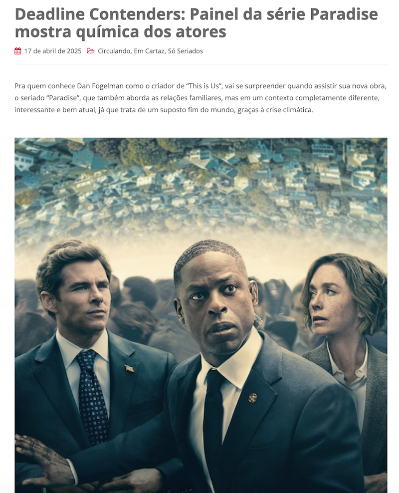 Eu amei da vida a série “Paradise”, criada por Dan Fogelman, o mesmo que criador de “This is Us”, e protagonizada pelo querido Sterling K. Brown, como contei na matéria sobre o meu encontro com Sterling no painel do Deadline Contenders, em abril.