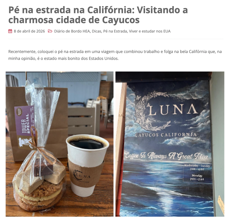 Na semana passada levei vocês em um tour na charmosa cidade de Cayucos, destino de turistas e surfistas, que fica entre Los Angeles e São Francisco, onde provei deliciosos cookies, diferentes de todos que já tinha experimentado, e visitei um café pra lá de aconchegante. Não deixe de conferir: