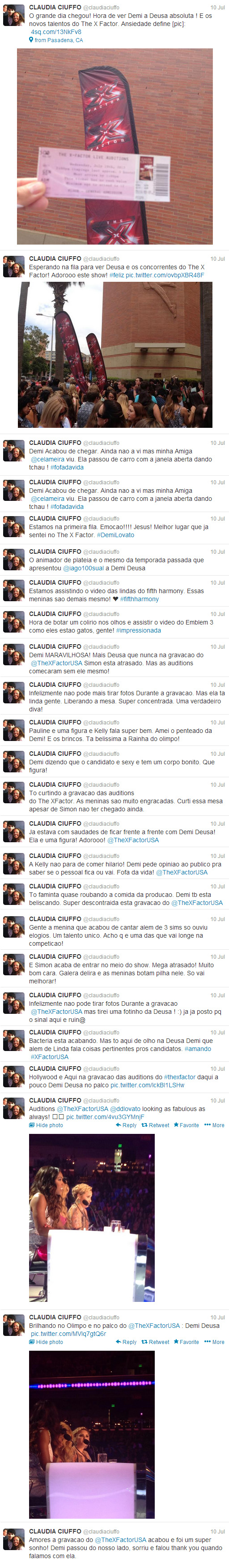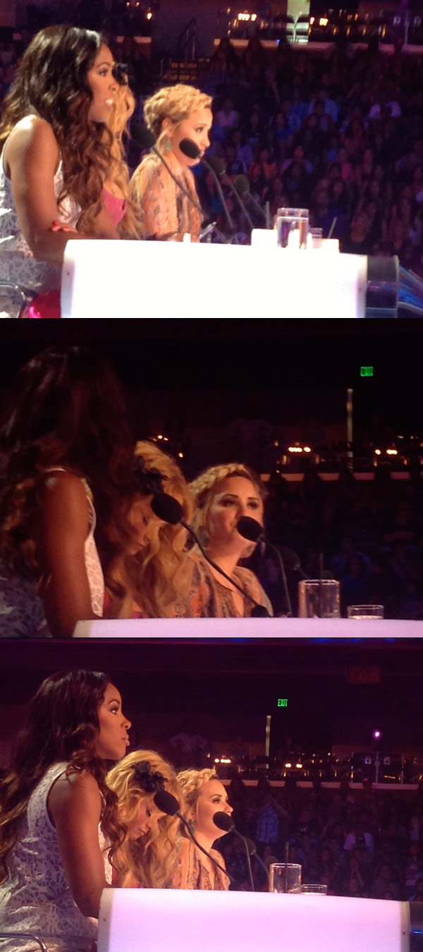 O dia é longo, chegamos às 10 da manhã ao Galen Center, no centro da cidade, e o programa começou a ser gravado depois das 14 horas. Apesar das longas horas esperando de pé, a emoção de ver Demi Deusa de pertinho compensa qualquer sacrifício. Ainda mais quando estamos em boa companhia, como Mari, Julia, Mayara e Bia. Para completar a alegria, a produção nos colocou na primeira fila, dos nossos lugares vimos Demi Lovato liderar a mesa de jurados, quando Simon se atrasou. A bela, mais firme e segura que nunca, deu um show a parte. A química entre ela, Kelly e Pauline é nítida. Tanto na frente das câmeras quanto nos bastidores, notamos que as moças estão trabalhando sério e se divertindo a valer. Entre gargalhadas e críticas, a descoberta de novos talentos e a eliminação de outros tantos candidatos Demi, Kelly e Pauline demostraram estar em completa sintonia. E Simon, que adentrou o teatro super bem humorado, quase 1 hora depois de iniciada a gravação, agora é um exemplo de que quando está cercado de lindas mulheres, a última palavra é sempre delas. Foi voto vencido em algumas das audições.
