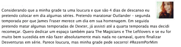 Nossa coluna “Só Seriados” essa semana é em homenagem a Jussara, vencedora da promoção Bloco dos Viciados em Seriados. Ela, guerreira, concluiu sua maratona no Carnaval e ainda levou os brindes do Hollywood é Aqui. Nosso agradecimento a Jussara e a todos os apaixonados por essas séries maravilhosas que participaram da promoção e acompanham o nosso trabalho.